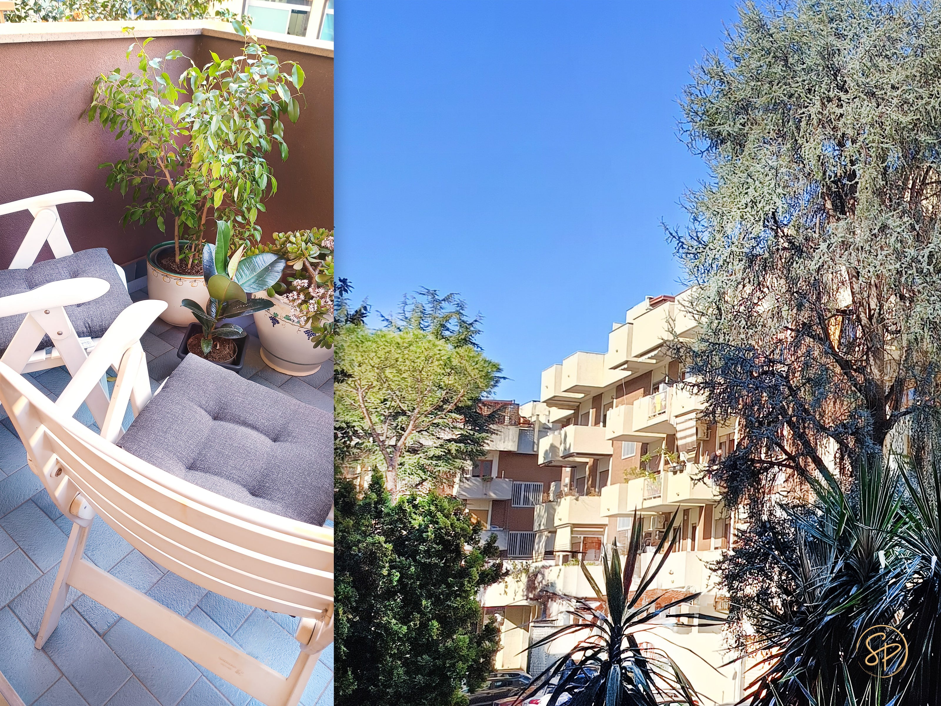 Uno de los dos balcones ofrece un rincón de relax rodeado de vegetación , con exuberantes plantas y cómodos sillones , perfecto para disfrutar de un momento de tranquilidad con vistas al parque. El espacioso baño del apartamento ofrece ducha y bañera, así como lavadora de carga superior .