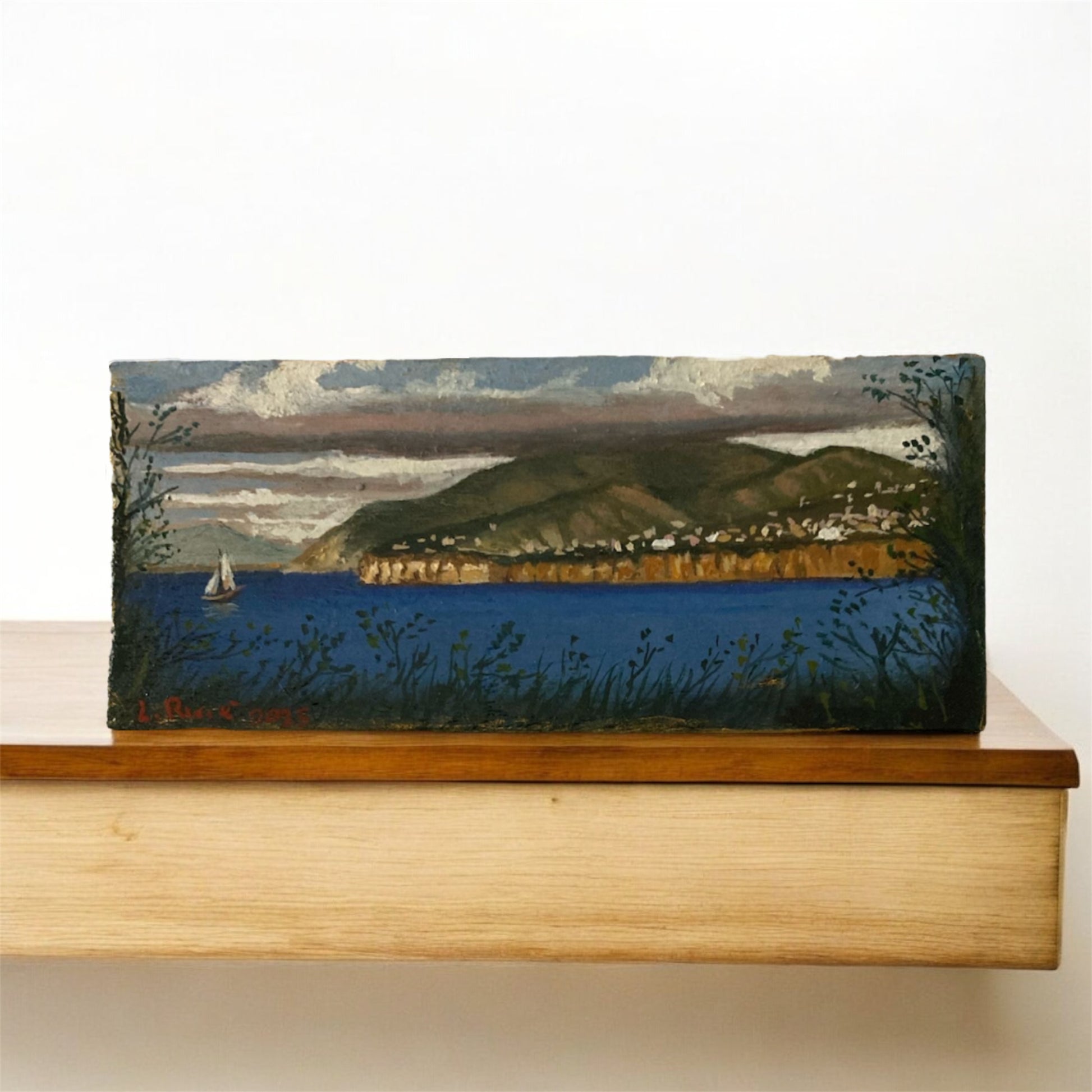 Con le sue dimensioni compatte (14 × 6 cm), questo dipinto si presta perfettamente ad arricchire piccoli spazi con eleganza e autenticità: su mensole, cornici o angoli lettura, diventa un frammento di viaggio e memoria. Nonostante il formato ridotto, la scena marina e la presenza della barca aggiungono profondità e movimento, evocando l’essenza stessa del Mediterraneo.